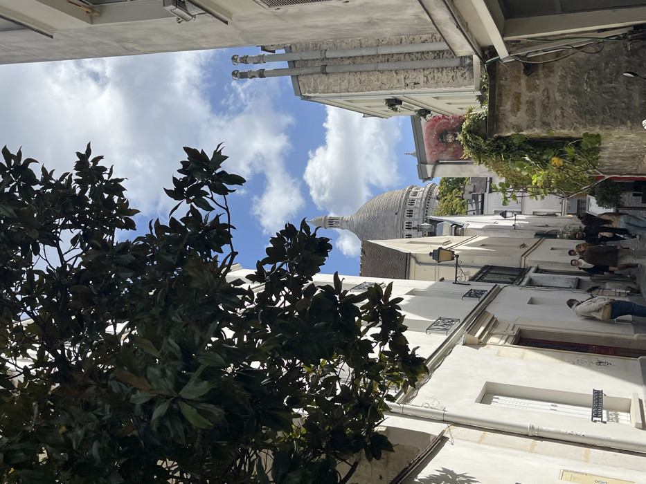 The image displays a narrow, inclined street within the Montmartre district of Paris, France, under a partly cloudy blue sky