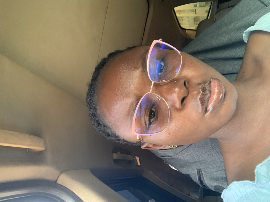 A woman with dark skin, wearing glasses with pink frames, is seated inside a car