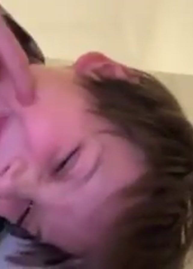 A young boy is lying down and laughing as someone pokes his face. The boy is wearing a t-shirt with a graphic design. The background appears to be a white wall or possibly a bathtub.