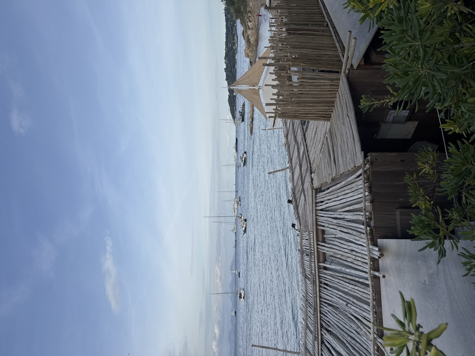 This image captures a coastal scene in Saint-Tropez, France, depicting a bay with numerous vessels and a rustic beachside establishment. The sky is a light blue with sparse, wispy white clouds. The calm, blue-grey water of the bay is populated by approximately twenty boats of varying sizes, including at least six large sailboats with prominent masts, several smaller motorboats, and distant larger yachts. On the right, a rocky, vegetated coastline with green shrubs and trees defines the immediate background. A small sandy beach area is visible, where a single individual in red clothing stands partially obscured. In the foreground and mid-ground, a multi-level wooden structure, likely a beach club or restaurant, dominates. This establishment is constructed from dark wooden planks and features roofs or canopies made of numerous parallel light-colored wooden poles. Vertical fences, also made of wooden poles, delineate sections of the structure. A prominent light-tan canvas tent with a pointed roof is integrated into the right side of the wooden complex, situated close to the water's edge. Two dark, indistinct figures are discernible on a lower wooden platform above the water in the mid-left. Green foliage is present in the immediate foreground, framing the bottom of the image.