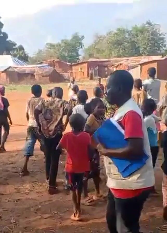 group of approximately thirty children, mostly boys, gathered in a dirt field in what appears to be a rural setting. There are houses with corrugated metal roofs in the background, some made of red brick. A man wearing a white vest with organizational logos is walking around the group of children while holding a blue folder. He seems to be supervising or instructing the children. Some children are walking around, while others are clustered together looking at something on the ground. One person appears to be kneeling on the ground. The overall atmosphere is one of community and activity.