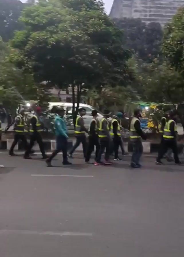 group of people walking along a road in what appears to be a city. Most of them are wearing yellow vests. They are walking in the same direction, moving from left to right in the frame. The road is paved, and there is a line of trees along the side of the road. In the background, there is a tall building. There are also some other vehicles on the road, including a motorcycle and a pedicab. The sky appears overcast, suggesting either a cloudy day or perhaps early morning light.
