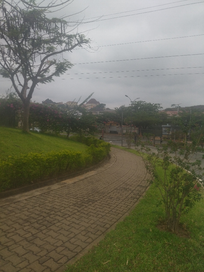 paved pathway curving to the right, lined with short green hedges and grass. In the foreground, a bush with small green leaves grows on the right side of the pathway. The pathway leads to a small street that extends beyond the frame. The street has paved edges and is bordered by grass and trees. In the distance, a line of houses with pitched roofs can be seen through the trees. The sky is overcast with a thin layer of grey clouds and several power lines run across the image from left to right. The scene is in Aso, Nigeria, with the coordinates 9.047 latitude and 7.535 longitude.