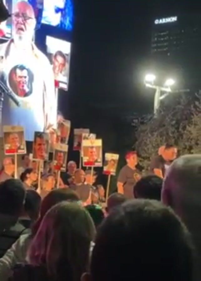 A crowd is gathered outdoors at night, listening to a man speaking at a podium, visible behind the crowd. The man has dark hair, wears a dark shirt, and is standing beside a woman with reddish-purple hair who wears a T-shirt with a design on it. Many in the crowd are holding up pictures of a man on sticks. Behind the speaker, a large screen displays several images of the same man, with text in Hebrew above him. A tall building with "ARNON" visible at the top is in the background. The camera angle is from within the crowd. There are several light poles visible.