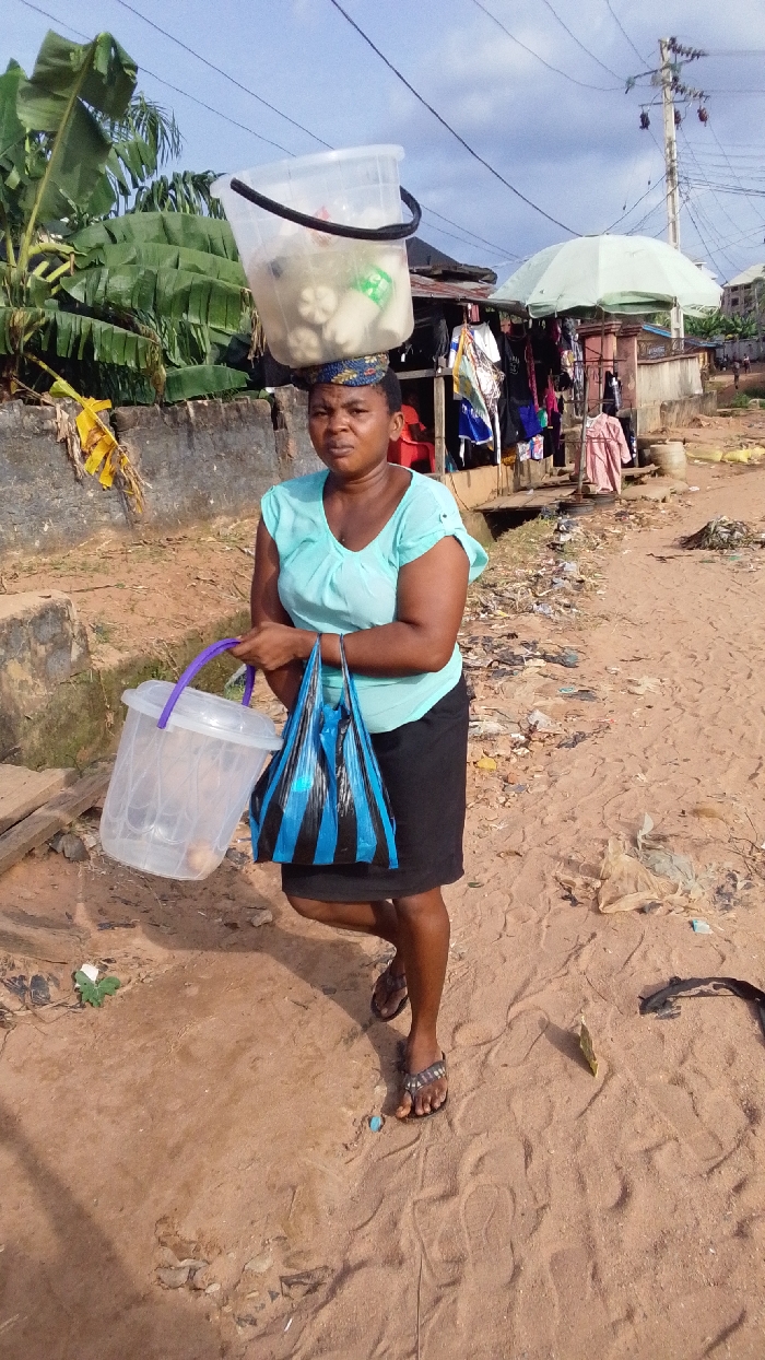An adult female is depicted standing on an unpaved, sandy street in Onitsha, Nigeria, under a partly cloudy sky