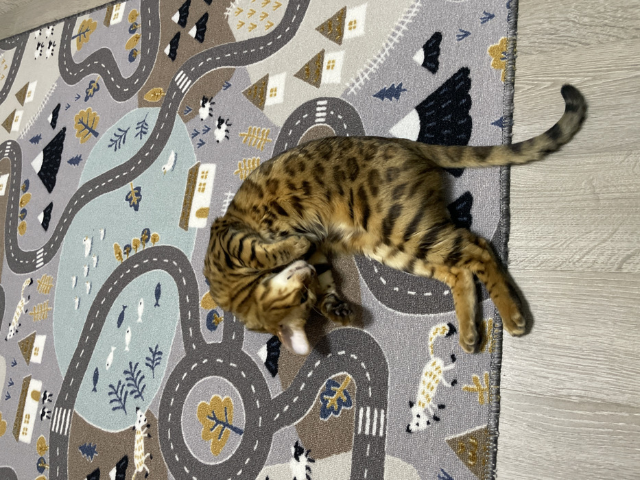 - "A Bengal cat is curled up on a children's rug with a road map design" by FM-NoKcg2, licensed under CC BY 4.0