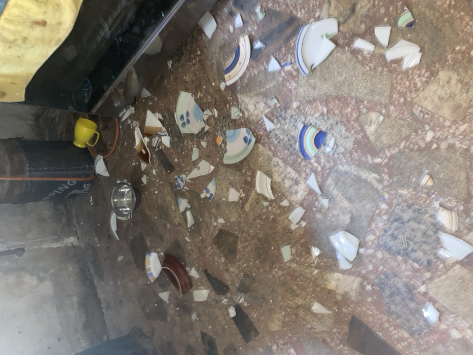 The scene is an interior location in Narayi, Nigeria. The floor, composed of multi-toned terrazzo or tiled material, is extensively covered with numerous fragments of shattered ceramic and porcelain dishes. These fragments display various patterns including blue floral, striped, solid brown, and plain white designs. A small, intact silver-colored metallic bowl rests on the floor among the broken pieces, slightly left of the image center. Towards the rear of the room, a yellow plastic pitcher with a handle lies on its side, near a dark, rectangular object with partial text visible ("PPING NG"). An orange cable is partially visible near the yellow pitcher. The background wall appears rough and discolored. A dark, reflective surface, possibly a countertop, is visible along the right edge of the frame. No individuals are present.