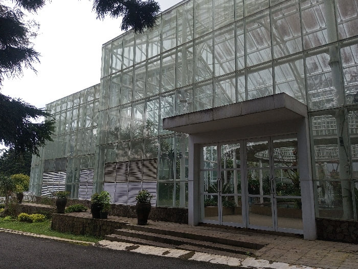 A large glasshouse facade dominates the frame, revealing an interior filled with plants and intricate metal support structures