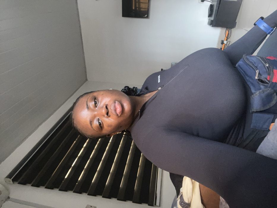 A person in a black athletic outfit lies on a bed. They have dark hair and skin and are looking directly at the camera with a neutral expression. A dark blue backpack rests behind them. The blinds behind them are partially drawn. The room has light grey walls. A television and speakers are visible in the background.