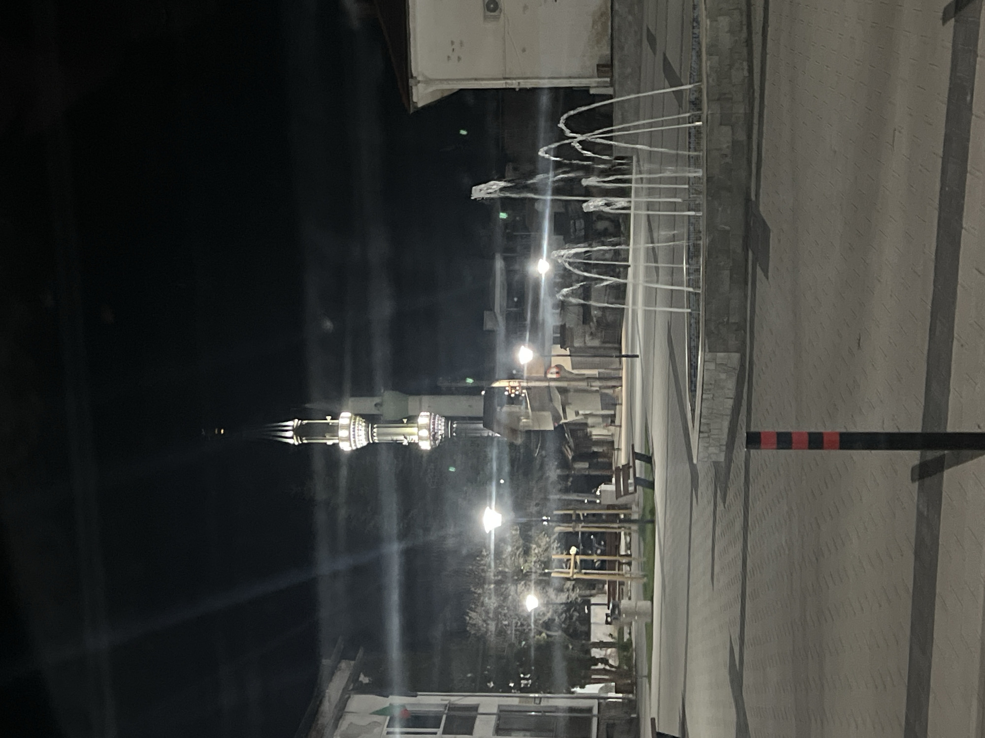 This image shows a minaret, possibly of a mosque, illuminated at night in Kornitsa, Bulgaria. In the foreground, a paved square is visible with a fountain. Streetlights are present, and some buildings can be seen in the background. The overall scene is a nighttime view of an urban area.