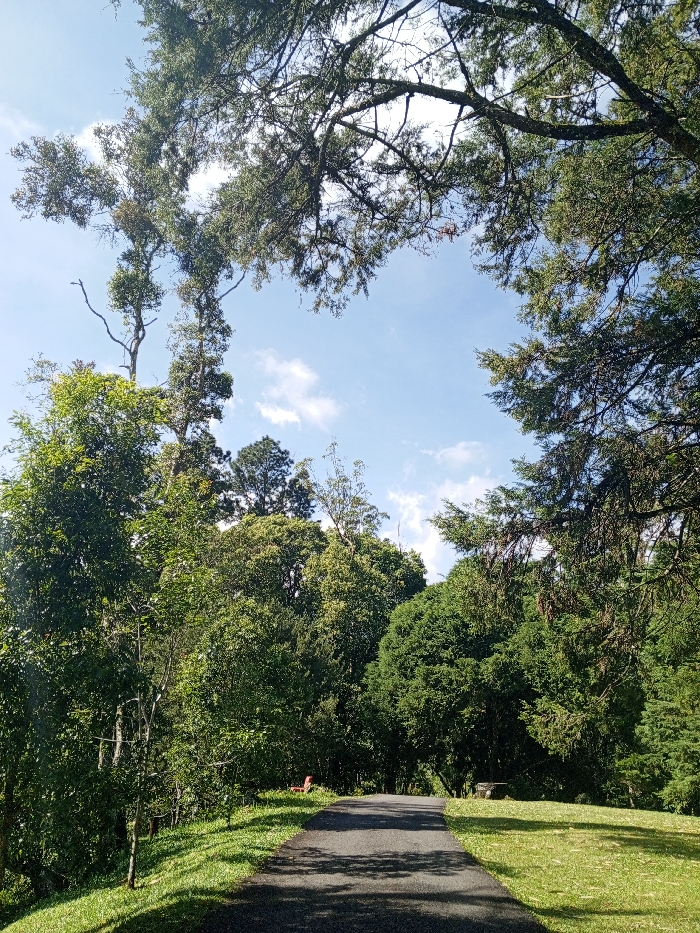 A path cuts through a green landscape dotted with trees. The branches of taller trees frame the sky, creating a natural canopy. The path is dark asphalt, contrasting with the vibrant green grass on either side. Sunlight filters through the trees, casting shadows on the path and adding depth to the scene. Two small objects, perhaps benches, appear further down the path and on the grass.