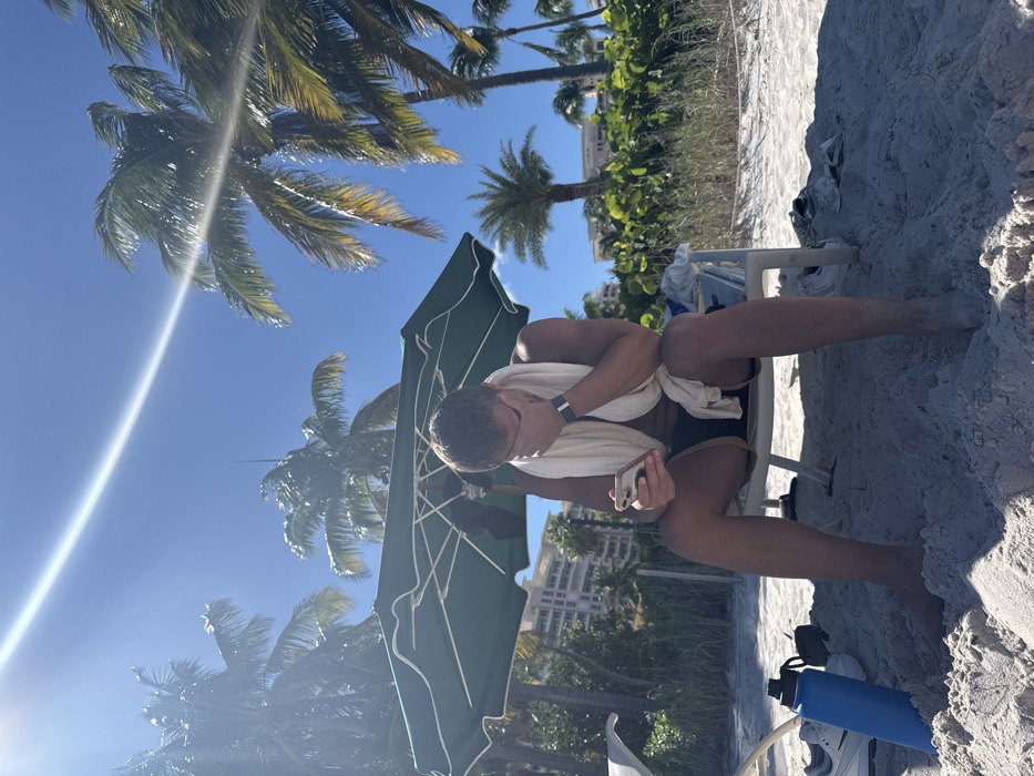 A male individual is seated on a beach chair under a dark green umbrella on a sandy beach in Key Biscayne, United States. He is wearing dark swim shorts and has a light-colored towel draped around his neck. A dark fitness tracker is visible on his left wrist. He is holding a light-colored smartphone in his right hand and his left hand is covering the lower half of his face, suggesting distress or contemplation, as he looks down at the device. To his left, a blue water bottle and white sneakers rest on the sand. The background features numerous tall palm trees, dense green vegetation, and multi-story buildings, consistent with a resort or residential area. The sky is clear and blue, with direct sunlight casting shadows and producing lens flare.