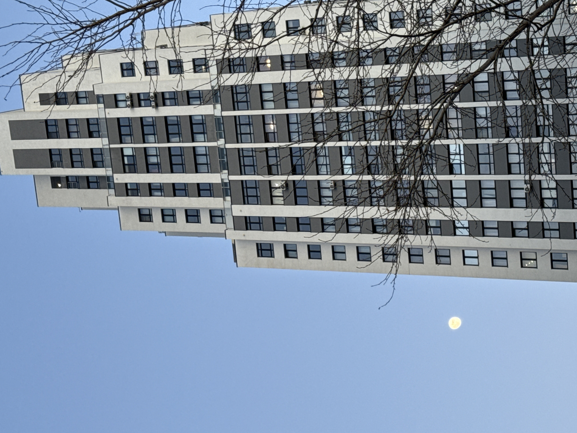A low-angle photograph depicts a modern building with a receding multi-level facade, set against a blue sky. The building features a repeating pattern of dark-framed windows alternating with light and dark gray horizontal stripes. A tree branch with bare twigs partially obscures the top of the building. In the clear sky below, a full moon is visible. The building is potentially in Yekaterinburg, Russia, though no landmarks are visible to confirm its exact location.
