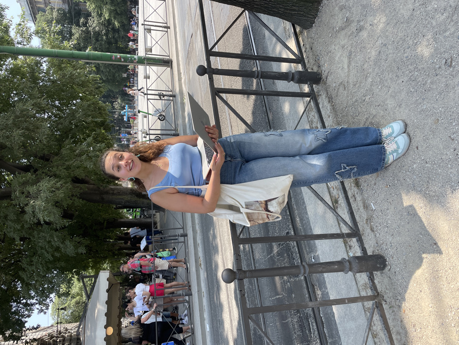 A young woman sits on a black metal fence in a sunny, outdoor location, possibly a park or public area. She wears a blue tank top and jeans with star-shaped cutouts. She holds a laptop and has a white tote bag slung over her shoulder. People and trees are visible in the background, along with scooters and a building. The photo appears to be taken on a bright day.
