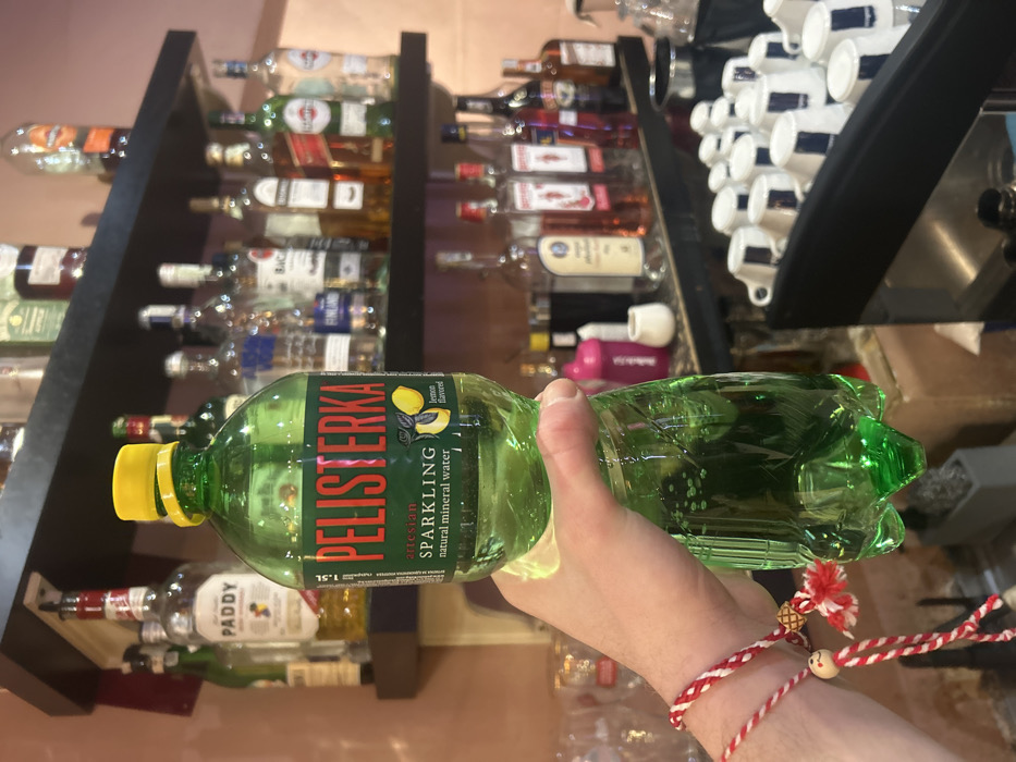A close-up, eye-level shot captures a hand holding a green plastic bottle of "PELISTERKA" sparkling lemon-flavored natural mineral water, featuring a yellow screw cap and a visible label indicating "1