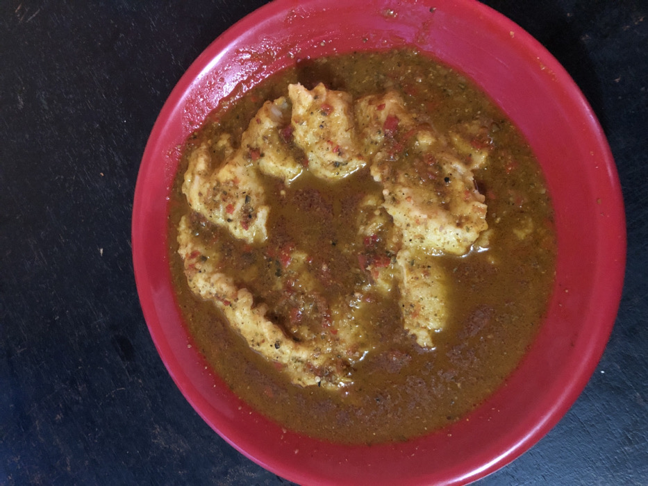 An overhead view captures a single red, circular bowl filled with food, positioned on a dark, textured surface, likely a table, in Sabon Gari Nassarawa, Nigeria. The bowl contains several irregularly shaped, light-colored solid pieces submerged in a reddish-brown liquid sauce. The solid pieces, possibly fufu or pounded yam, exhibit a coarse texture and are visibly seasoned with dark specks and red flakes. The sauce is thick and opaque, also containing fine red and dark particulates. No people or other objects are visible in the immediate vicinity.