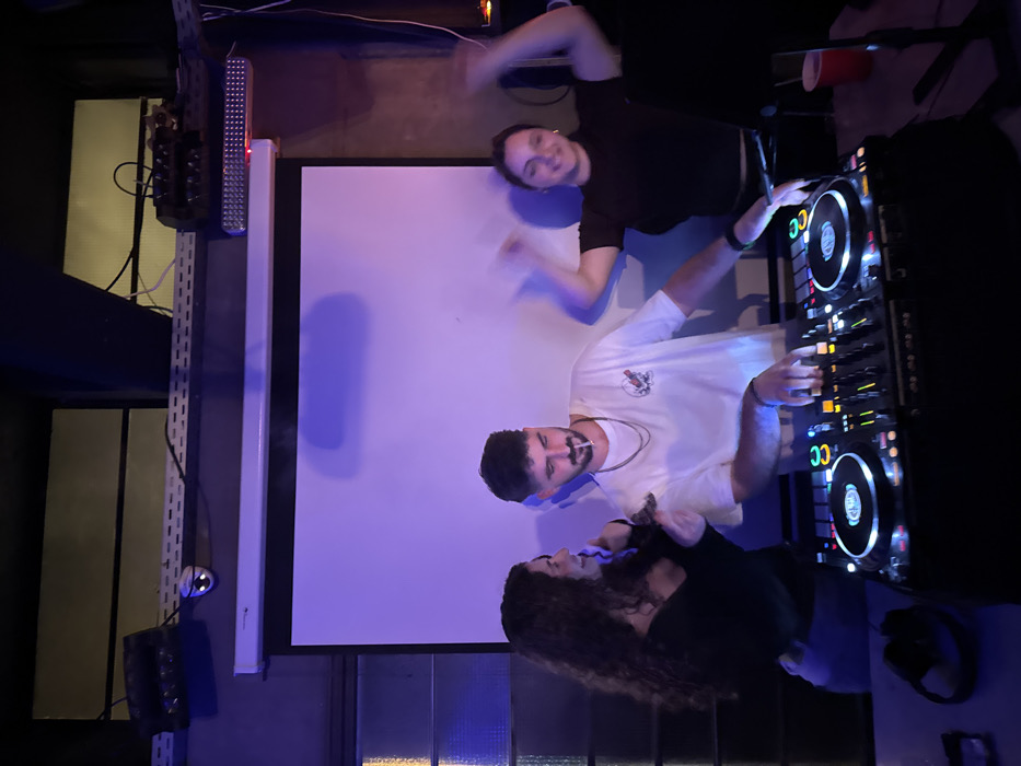 Three people gathered around a DJ turntable. A man with a beard and a white t-shirt is operating the equipment, while a woman with curly hair in a dark shirt stands next to him. Another woman in a dark top is raising her arm in the background. The scene is lit with purple and blue light. There is a projection screen behind them, and electronic equipment is visible on a metal rack in the corner.