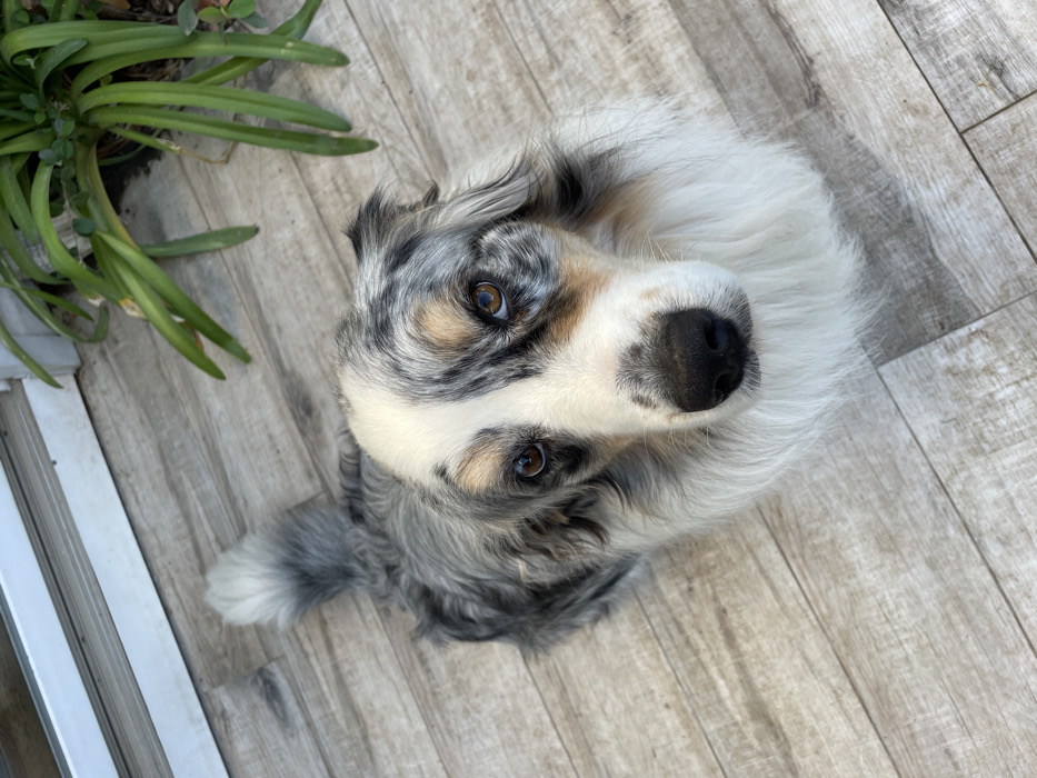 - "A blue merle Australian Shepherd dog sits on a wooden floor in a residential home located in Lo Barnechea, Chile, at the coordinates -33" by FM-sch3q2, licensed under CC BY 4.0