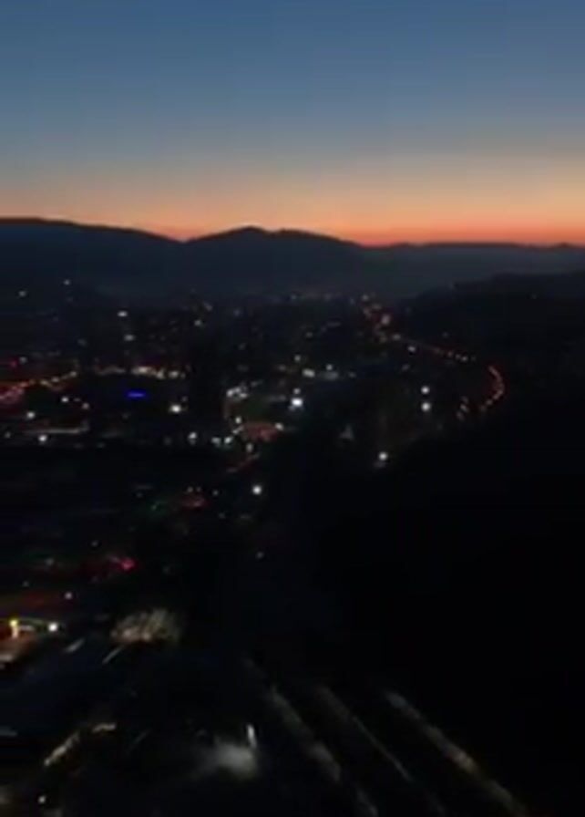 n aerial view of a city at dusk. The sky is a gradient of blue and orange. Mountains can be seen in the distance. The city lights are illuminated, creating a blurry view of the buildings and roads. There is no visible presence of people or identifiable objects beyond the buildings and roads. The focus is on the cityscape at twilight.