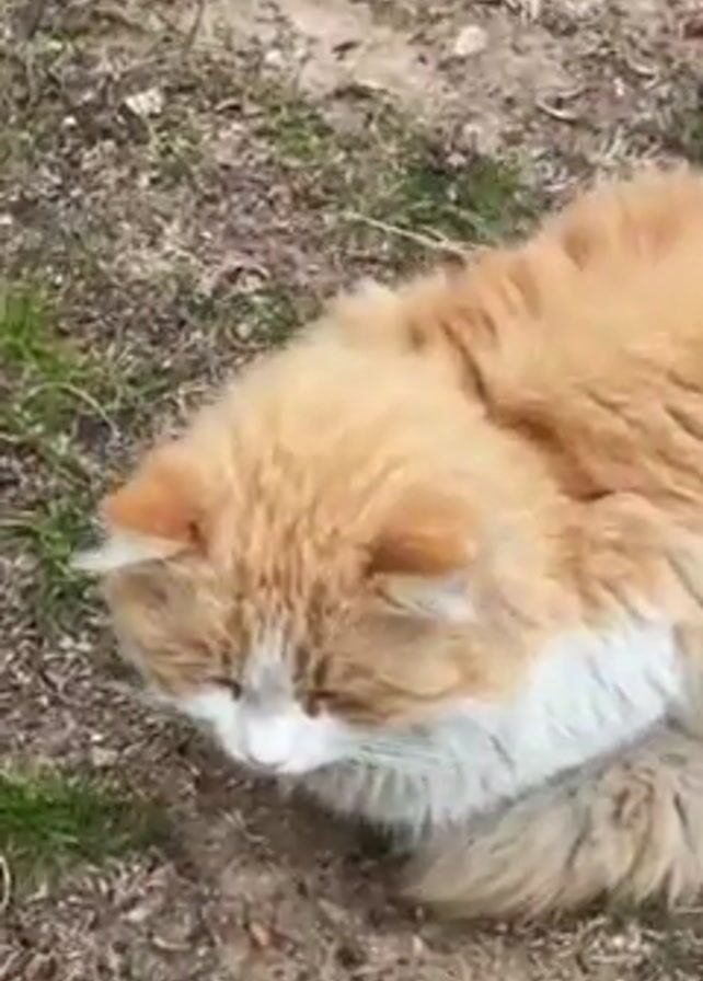 fluffy, orange and white cat resting on the ground. The ground is covered with dirt, some patches of green grass, and a few leaves. The cat is lying down and appears relaxed, with its eyes mostly closed. There is a single yellow dandelion flower nearby. The camera zooms out and circles the cat.