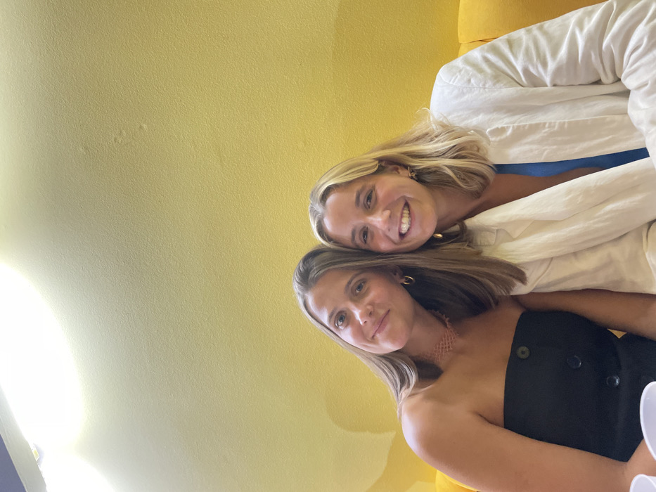Two young adult females are depicted indoors against a textured yellow wall, illuminated by an overhead linear light source visible in the upper left. The female on the left, with long light brown hair, wears a black strapless top with central buttons and a pink choker, accessorized with gold hoop earrings. She gazes directly at the camera with a slight smile. The female on the right, with medium-length blonde hair, wears a white blazer over a blue garment, and small gold earrings. She smiles broadly at the camera, showing teeth. A yellow upholstered surface is visible to the right, and the rims of two white plastic cups are partially visible at the bottom left. The specific location within Lisbon, Portugal, cannot be determined from the provided visual data.