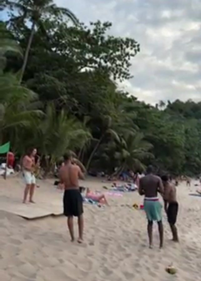 On a sandy beach, a group of shirtless men entertain a crowd of sunbathers. To the left, a man plays a saxophone. Three dark-skinned men rhythmically drum on their chests and thighs. A coconut lies on the sand in the foreground. Palm trees and dense tropical foliage line the back of the beach, and a cloudy sky is overhead. People are lounging on the beach in the background.