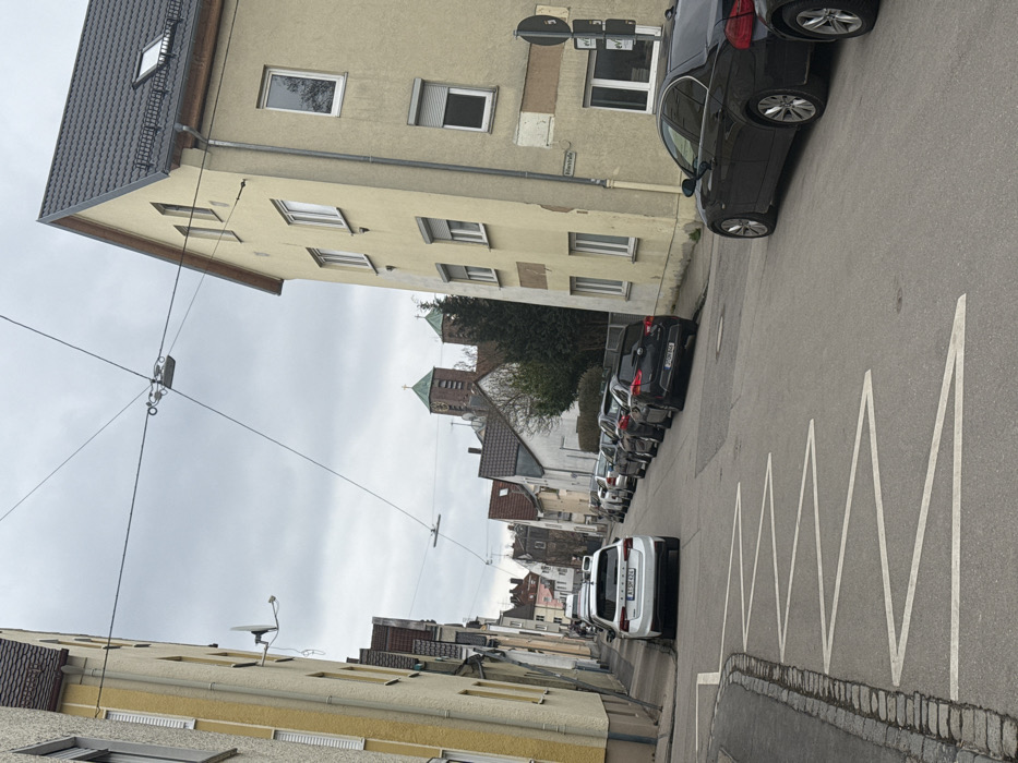 The image depicts a street scene in Augsburg, Germany, specifically identifying as Pillofstraße from a visible street sign on the right building. The scene is observed on an overcast day with no direct sunlight. The foreground features a paved street with prominent white zigzag no-parking markings on the left, adjacent to a stone curb. A line of parked vehicles extends into the distance on both sides of the street. On the left side of the street, a light-yellow, multi-story residential building with a partially visible tiled roof and a mounted satellite dish is present. Further down the left, additional residential buildings line the street. A white Volkswagen T-Cross (license plate A-BF 426) is parked on the left side, facing away from the viewer. On the right side of the street, a light-yellow, four-story building with a dark grey tiled roof is prominent. It features multiple windows, some with closed roller shutters, and a vertical downspout. The "Pillofstraße" sign is affixed to this building. Two dark-colored sedans, one partially visible, are parked in the foreground on the right, facing the viewer. Further down, a line of parked cars includes a dark hatchback (license plate D-ON 84X, last digit obscured) facing away from the viewer. In the mid-ground, at the end of the street, a church with two distinct towers, each topped with a green conical roof, is visible. Overhead wires traverse the sky, connecting structures between the buildings. No individuals are visible in the scene.