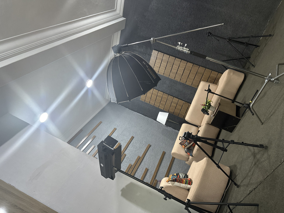 This image depicts an unoccupied professional studio space located in Jos, Nigeria, set up for photography, videography, and audio recording