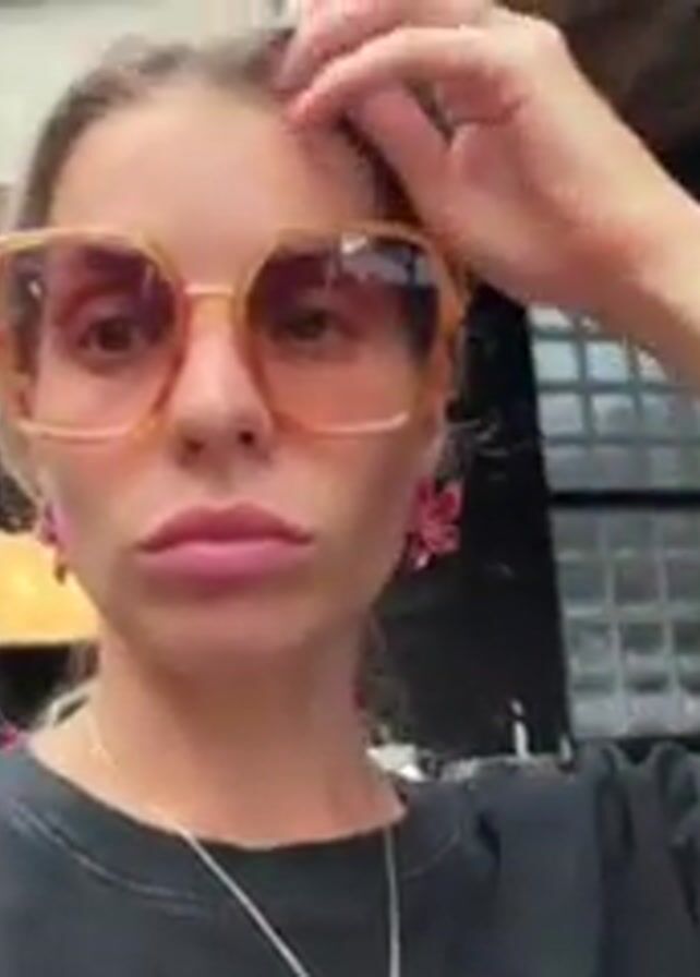 A woman in a black t-shirt and large sunglasses is filming a selfie video in what appears to be a restaurant. She touches her hair and adjusts her earring. She speaks directly to the camera. The background reveals tables and chairs, and a partial view of a kitchen area. The floor is a light grey.