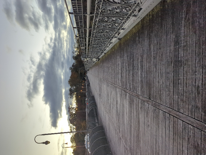 The image depicts a section of the Strawberry Mansion Bridge in Philadelphia, United States, under an overcast sky, likely during dawn or dusk. The foreground is dominated by a weathered wooden plank pedestrian walkway, extending into the distance, with a distinct longitudinal seam centrally located. To the immediate right, an ornate grey metal railing with intricate scrollwork patterns runs along the edge of the walkway. To the left, a vehicular roadway is visible, separated from the pedestrian path by a darker grey metal barrier composed of a series of arched, lattice-like sections. Several vehicles, appearing to be cars, are present on the roadway. Multiple black, curved lampposts with globe-shaped fixtures are spaced along the left side of the bridge. In the background, beyond the roadway, a dense line of deciduous trees, some displaying autumnal colors, extends across the horizon. The sky is covered with scattered grey clouds, exhibiting a faint yellow-white glow near the horizon. No individuals are visible on the pedestrian walkway.