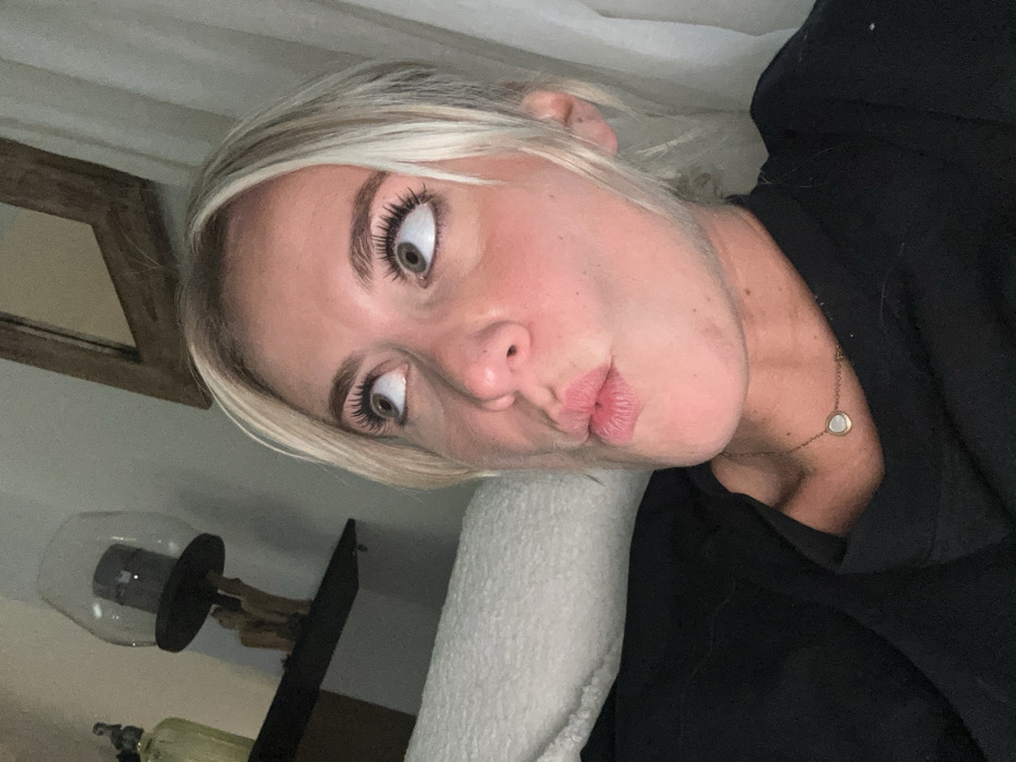A woman with blonde hair and fair skin poses with pursed lips and wide eyes