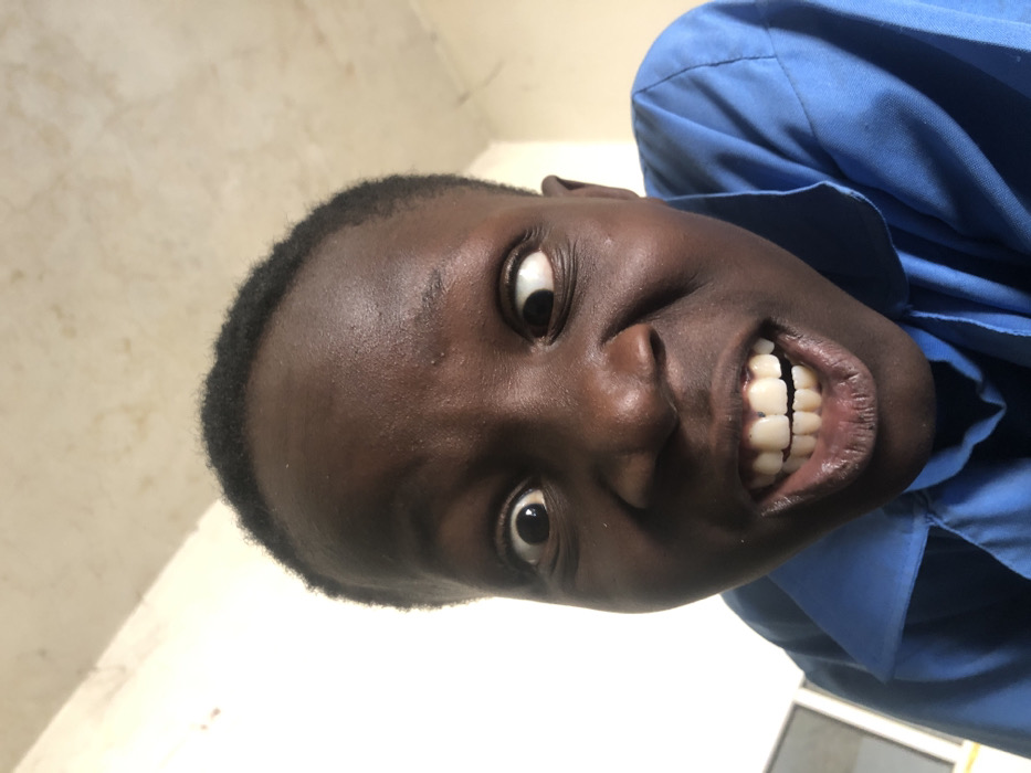 A close-up, front-facing photograph captures an individual with dark skin and short, dark, tightly curled hair making an exaggerated facial expression. The subject's eyes are wide open, with the right pupil centered and the left pupil strongly deviated towards the right. The mouth is open wide, revealing both upper and lower white, evenly spaced teeth and exposed gums. The face exhibits wrinkles on the forehead and around the eyes, consistent with the intense expression. The individual is wearing a blue collared garment, visible on the lower left and right portions of the frame. The background consists of an indistinct, light-colored interior surface, likely a wall or ceiling, displaying subtle textures and minor discolorations, particularly towards the top right. No other specific objects, individuals, actions, or interactions are discernible. The visual information present does not allow for the identification of the specific location as Muhammadu Dikko Stadium, Nigeria, or any other defined geographical site.