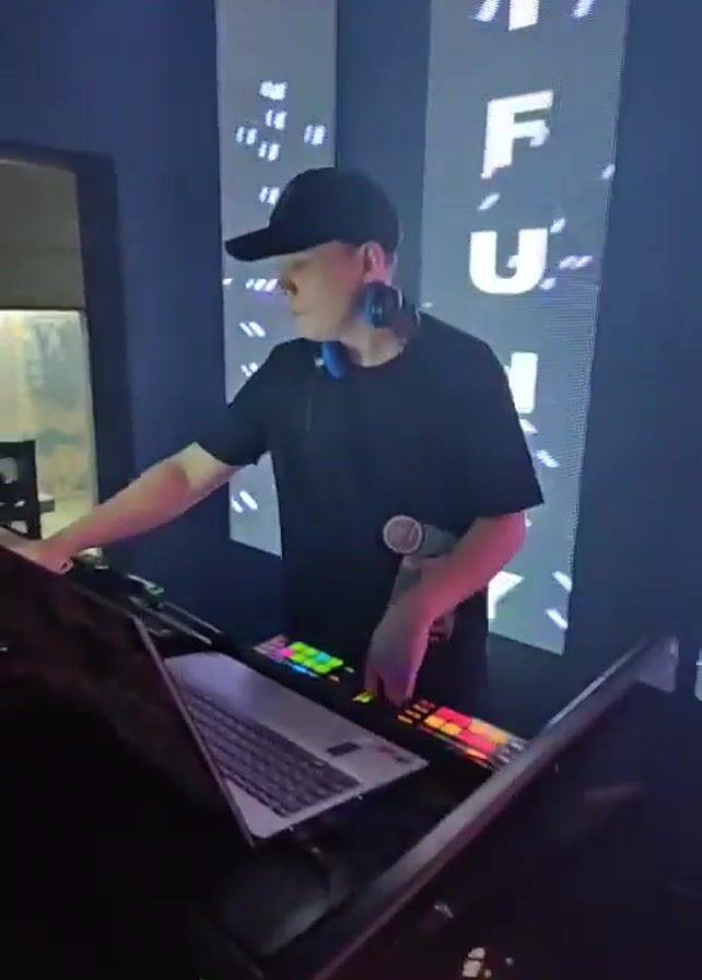 A man wearing a black T-shirt, black baseball cap, and blue headphones stands behind a DJ console in a dimly lit room. He looks to his right while adjusting equipment on the console, which includes a laptop, a Novation Launchpad Pro, and another midi controller. Behind him are two vertical LED panels displaying white abstract patterns and the word "FUNK." A doorway is visible to the left of the DJ console, leading to another room.