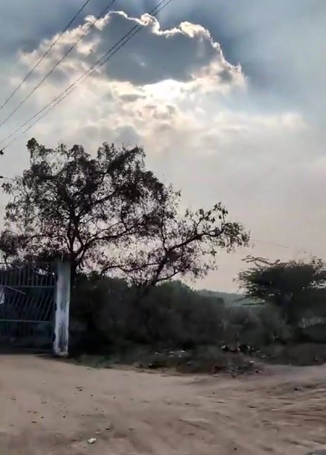 rural landscape. A cloud covers the sun in the background, and rays of sunlight stream out from behind it. Power lines are visible overhead. In the foreground is a dirt road leading to a gated entrance with concrete pillars. To the right of the gate is a tree with bare branches. A man rides a motorcycle from left to right on the road. The surrounding area appears to be undeveloped with sparse vegetation and dirt patches.