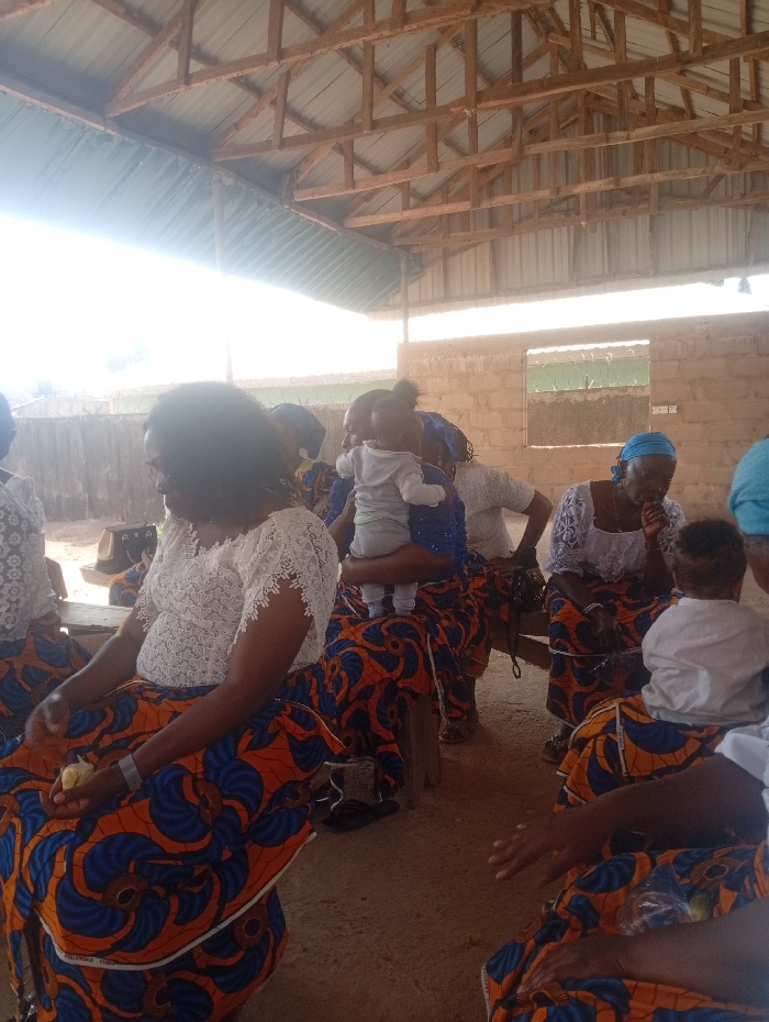 Inside an open-sided structure with unplastered concrete block walls, an exposed wooden truss roof, and corrugated metal sheeting in Narayi, Nigeria, approximately eight individuals are gathered