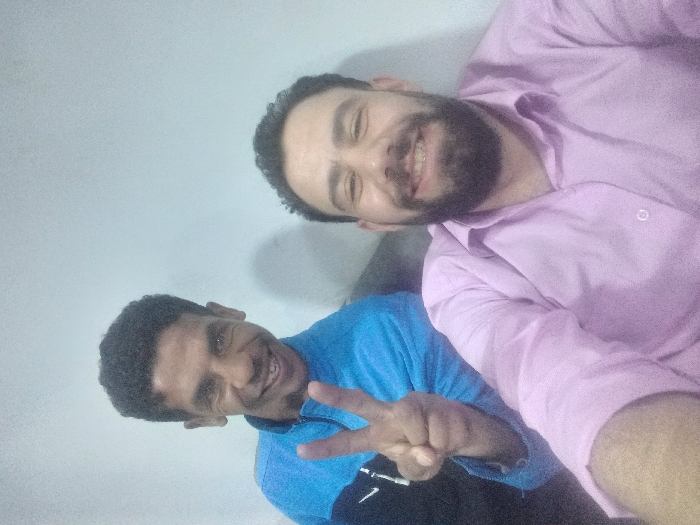 Two adult males are depicted in a close-up, indoor photograph against a plain, light-colored wall. The specific location within Munin, Syria, cannot be determined from the visual information provided. In the foreground and occupying the lower right portion of the frame is a male subject with a dark beard and short dark hair, wearing a light pink button-down shirt. He is smiling, showing teeth, and looking directly at the camera. Behind and to the left of the foreground subject, partially obscured, is a second male subject. He has short, curly dark hair and is wearing a blue and black long-sleeved top. He is also smiling, showing teeth, and looking directly at the camera. His left hand is raised, with the index and middle fingers extended in a V-shape, commonly known as a peace sign. The background is uniformly light, suggesting an interior space with minimal decorative elements. Lighting appears even, without harsh shadows, indicating an ambient light source.