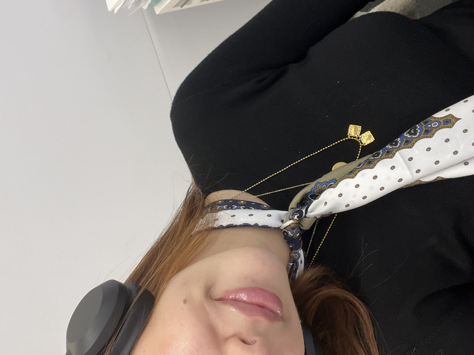 A person wearing black headphones, a black sweater, and a white scarf with blue and gold patterns. A gold necklace is draped around the scarf. The person's face is visible, showcasing their lips, which have a glossy appearance. They are positioned close to the camera, with a white wall in the background.
