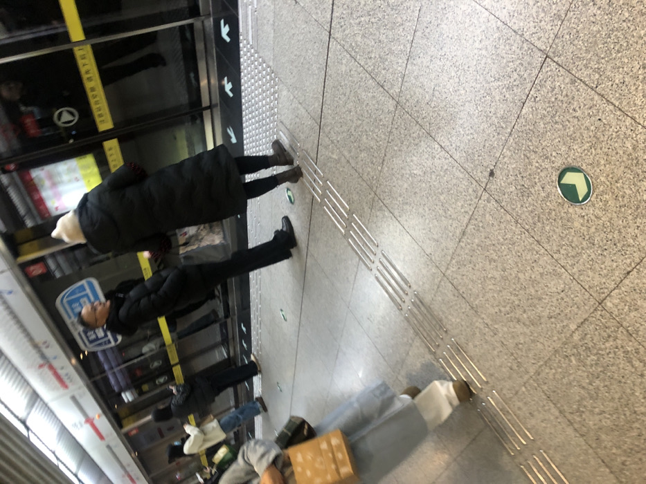 People stand in a subway station waiting for a train. Most are turned away from the camera, facing the train doors. One woman in a long black coat and a white hat stands at the front. Another person in black stands behind her. Other passengers with luggage stand or sit further back. The gray tiled floor has tactile indicators for the visually impaired and direction signs. The train doors are visible with arrow signs and a yellow vertical safety stripe.