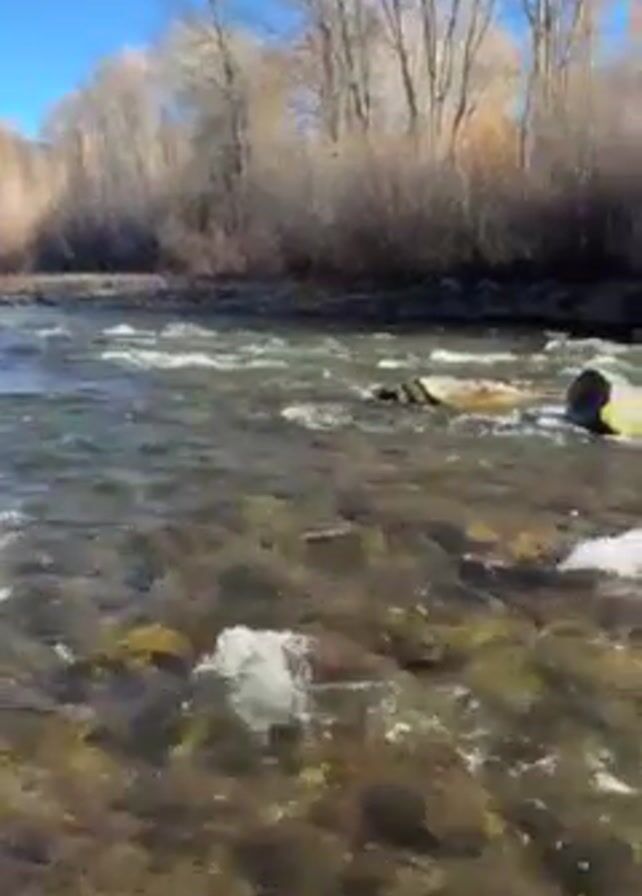 clear, flowing river with rocks visible beneath the surface. The water appears to be moving quickly, creating small whitecaps. The riverbanks are lined with trees and brush, mostly without leaves, suggesting it might be autumn or winter. The sky is clear and blue. The focus is on the natural scenery and the movement of the water.