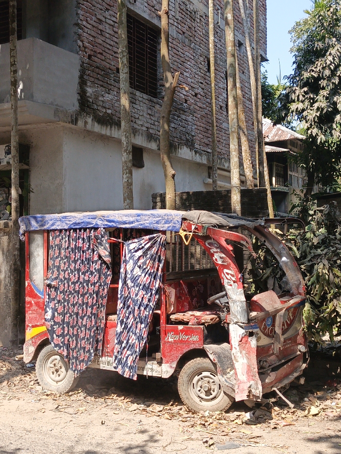 A red auto rickshaw stands parked on a dirt surface covered with leaves. The vehicle features patterned curtains draped on its sides and a blue tarp roof. It exhibits signs of wear, with visible rust and damaged body panels. Behind the rickshaw, a two-story brick building with a barred window and tall, thin trees lining its facade is visible. The backdrop includes additional foliage and glimpses of other structures in the distance, under a bright sky.