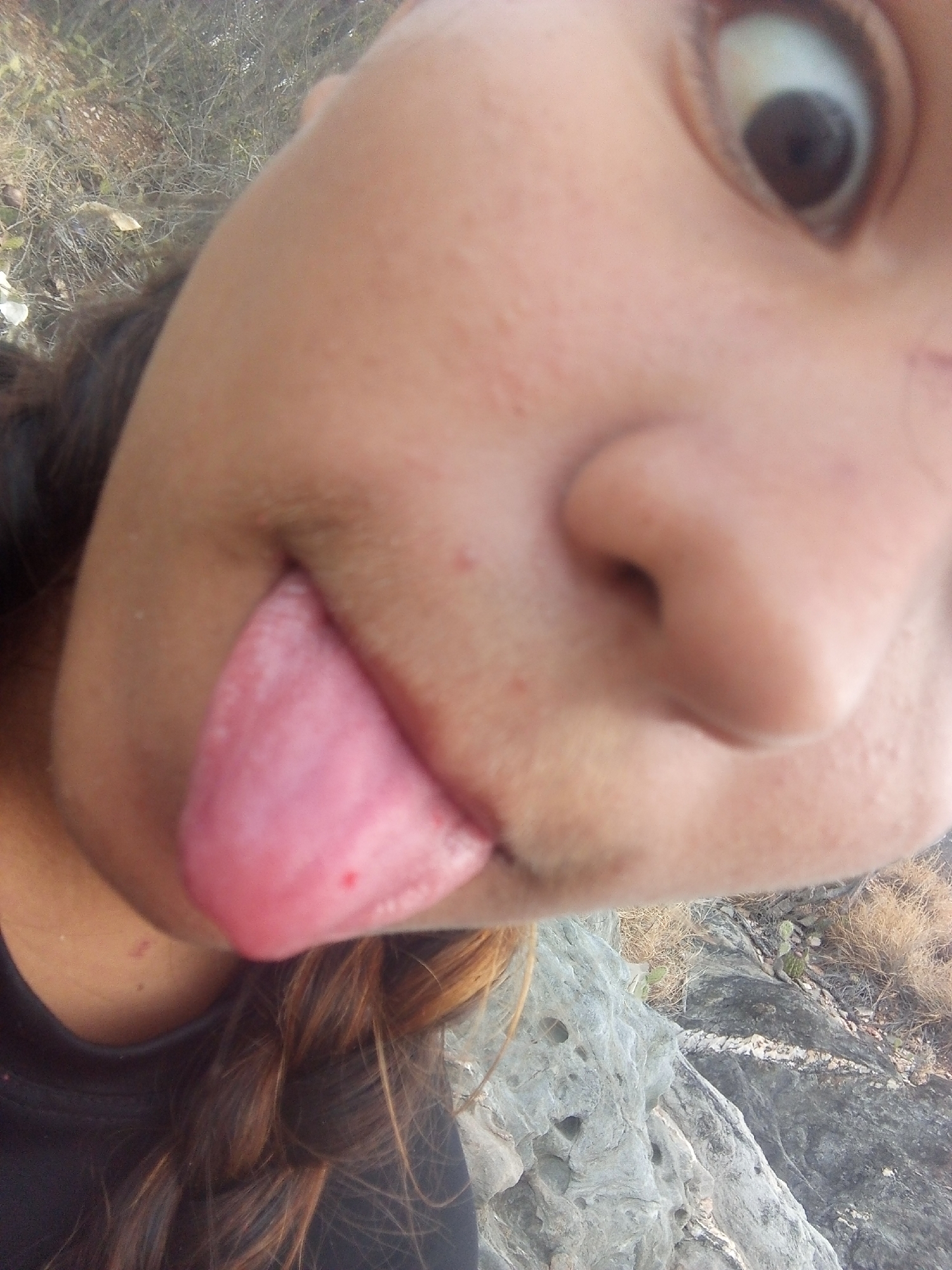 A selfie taken at close range focuses on a person's face. The person has light skin, brown hair, and is sticking their tongue out. Their right eye is wide open. A small red spot is visible on the tongue. In the background, some foliage and a light-colored, porous rock formation are visible, potentially indicating an outdoor location. Given the specified location of Juan Griego, Venezuela, the environment might be a rocky, coastal area.