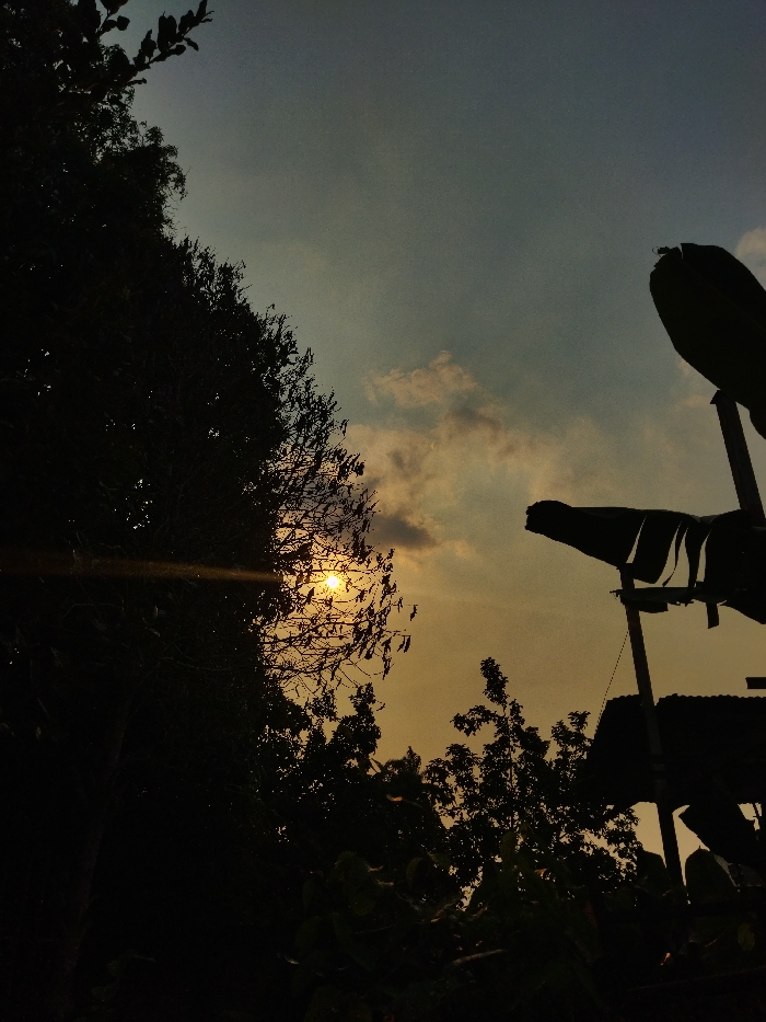 The image portrays an outdoor scene in Tinaquillo, Venezuela, observed during either sunrise or sunset. The upper two-thirds of the frame consist of a sky transitioning from a dark blue-grey at the top to a warm golden-orange closer to the horizon, dotted with sparse, light-colored clouds. A bright, circular sun is visible in the middle-left, partially obscured by the dense, dark silhouette of tree branches and foliage, from which a distinct lens flare emanates. A large mass of similarly dark, silhouetted foliage occupies the entire left side of the frame and extends across the bottom. On the far right, a man-made structure, possibly a canopy or makeshift shelter, is visible in silhouette. It features multiple dark, elongated, somewhat curved elements, suggestive of large leaves or tarps, supported by vertical poles. No human figures or direct actions are depicted. The scene is heavily backlit, emphasizing the silhouettes of the foreground elements against the illuminated sky.