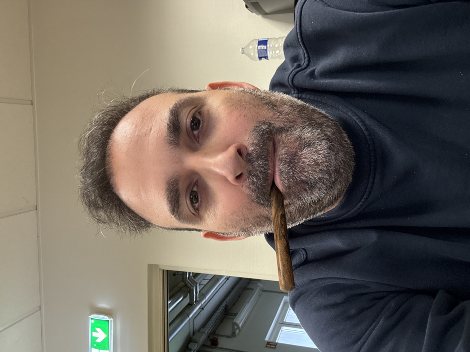 The image displays an adult male, estimated to be in his 40s or 50s, with dark, disheveled hair and a full, graying beard, centered and looking directly at the camera. He is wearing a dark blue crew-neck sweatshirt. A dark brown, polished wooden object is held horizontally between his lips. The background consists of light-colored walls and a white ceiling. In the upper left, a green illuminated exit sign with a white downward arrow is mounted on the wall. Below the sign, an open doorway reveals an interior area with exposed silver utility piping and a white-framed window. A clear plastic water bottle with a blue cap is visible on a surface in the upper right background. The specific location within Grevenmacher, Luxembourg, cannot be determined from the visual information.