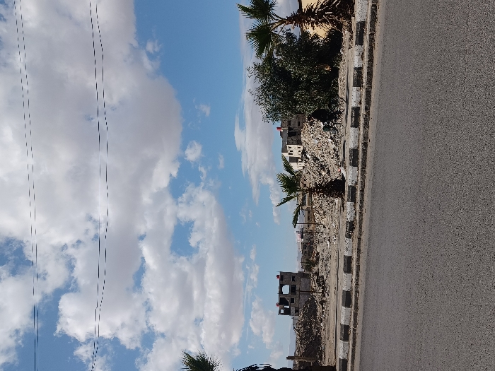 This image depicts a damaged urban environment in Al-Qadam Municipality, Syria. The foreground shows an asphalt road separated by a grey and black painted curb from a wide expanse of rubble and demolition debris. This debris forms uneven mounds across the midground. Several small palm trees are interspersed within the debris, alongside a large green bush on the right side. In the background, multiple partially constructed or damaged concrete buildings with exposed frames are visible, suggesting either unfinished development or structural ruin. One two-story concrete frame structure is prominent towards the left-center. An individual on a bicycle, dressed in dark clothing, is visible moving leftward in the mid-right portion of the scene, positioned near the large green bush. The sky above is blue with scattered white cumulus clouds, and multiple thin, dark utility lines traverse the upper frame. Distant hills are faintly visible on the horizon. No other specific actions or interactions are discernible.