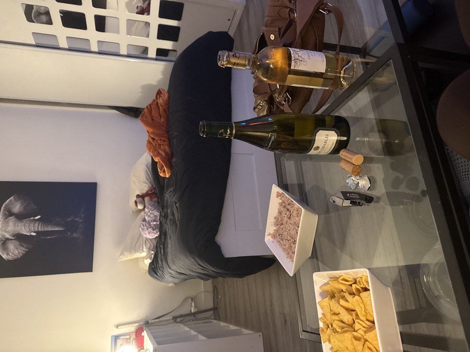 The image displays an indoor domestic scene, likely an apartment bedroom or studio, with evidence suggesting a French context due to product labeling. The specific location within the city of Paris cannot be determined from visual information. In the foreground, a glass-top coffee table with a black frame is central. On this table are two white rectangular bowls: the left bowl contains golden-orange, shell-shaped snack food, and the right bowl contains a light brown, granular, possibly minced food item. Two wine bottles are also present; the leftmost is a green glass bottle, partially full, labeled "Petit Chablis," and the rightmost is a clear glass bottle, also partially full, with a label partially obscured but appearing to read "Prosé." Between the bowls and bottles are a black and silver corkscrew, a crumpled silver foil wrapper, and two wine corks. A brown leather handbag is situated on the right side of the coffee table, behind the clear wine bottle. In the background, a bed with a black duvet, white pillows, and a white frame is positioned against a light-colored wall. An orange blanket or throw is loosely draped over the bed, alongside a purple fluffy pillow and a small red stuffed animal. Above the bed, a large black and white canvas art piece depicting an elephant's head is mounted on the wall. On the left side of the frame, a white multi-shelf unit is partially visible, with a lamp and other indistinct items on its top shelf. On the right, a white wardrobe featuring a pattern of square, reflective panels is seen. The floor throughout the visible area is covered with light-toned wooden or laminate planks. No individuals are present in the scene.