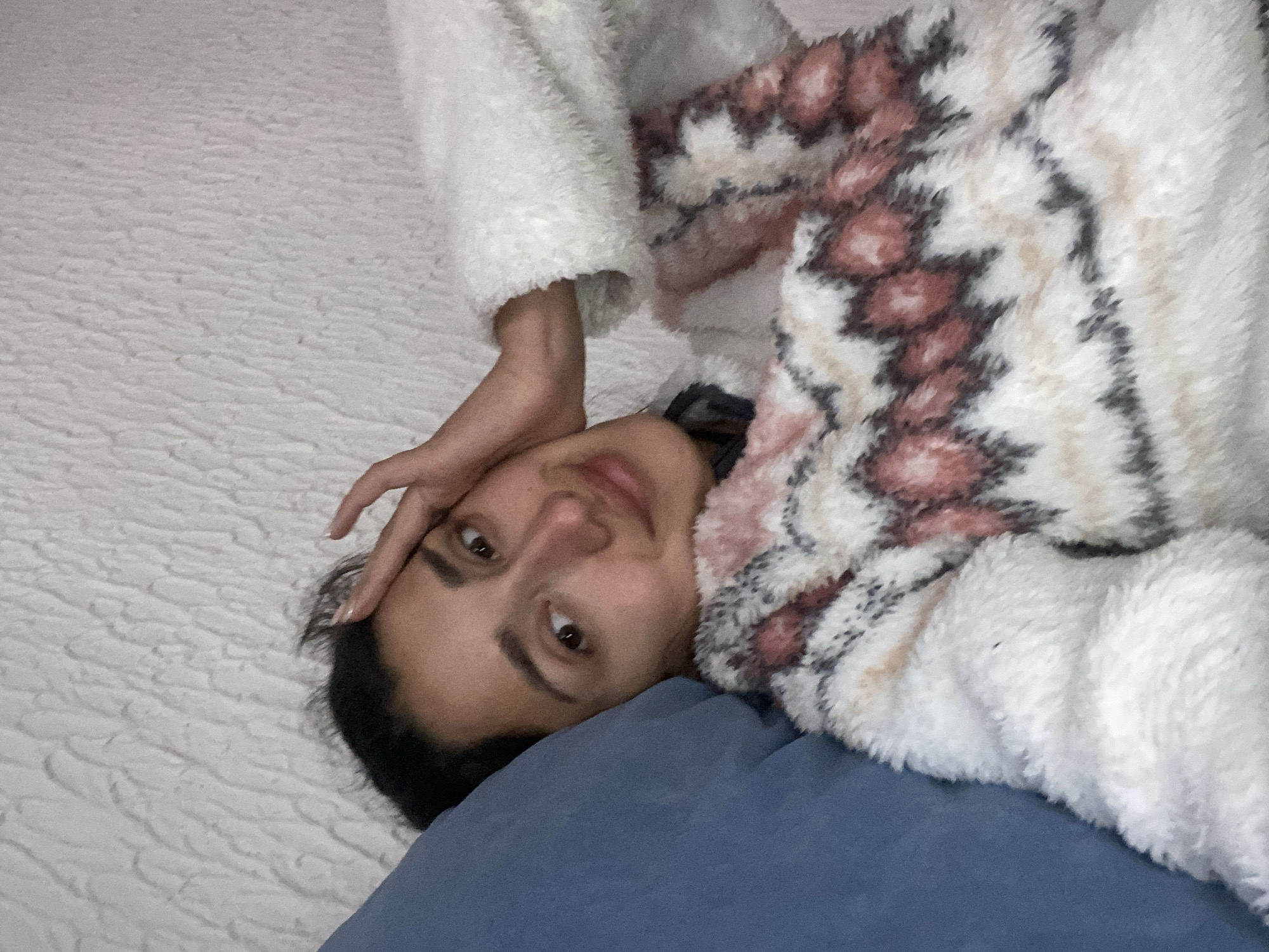 A person is lying on a bed with a blue pillow. The person is wearing a white, fuzzy jacket with pink and brown patterns. The person's head is resting on the blue pillow, and their right hand is touching their forehead. The bed has a white textured bedspread. The location of the image is not discernible from the visual information.