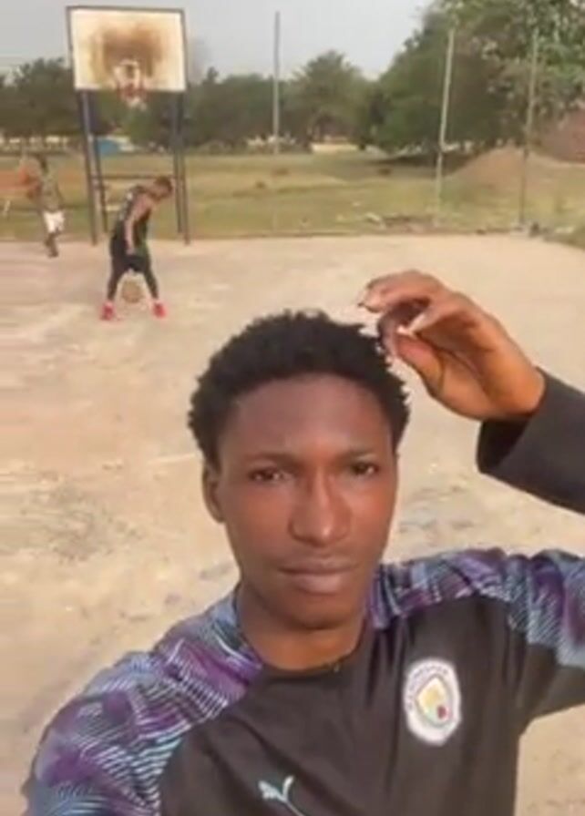 young man taking a selfie video at an outdoor basketball court. He is wearing a black, long-sleeved shirt with purple and blue accents on the sleeves, a Puma logo, and a Manchester City emblem. He runs his fingers through his short, curly hair as he holds the camera. Behind him, other people can be seen playing basketball on a court with a simple hoop. The background includes trees, buildings, and a fence. The ground appears to be dirt. The weather looks bright but overcast.