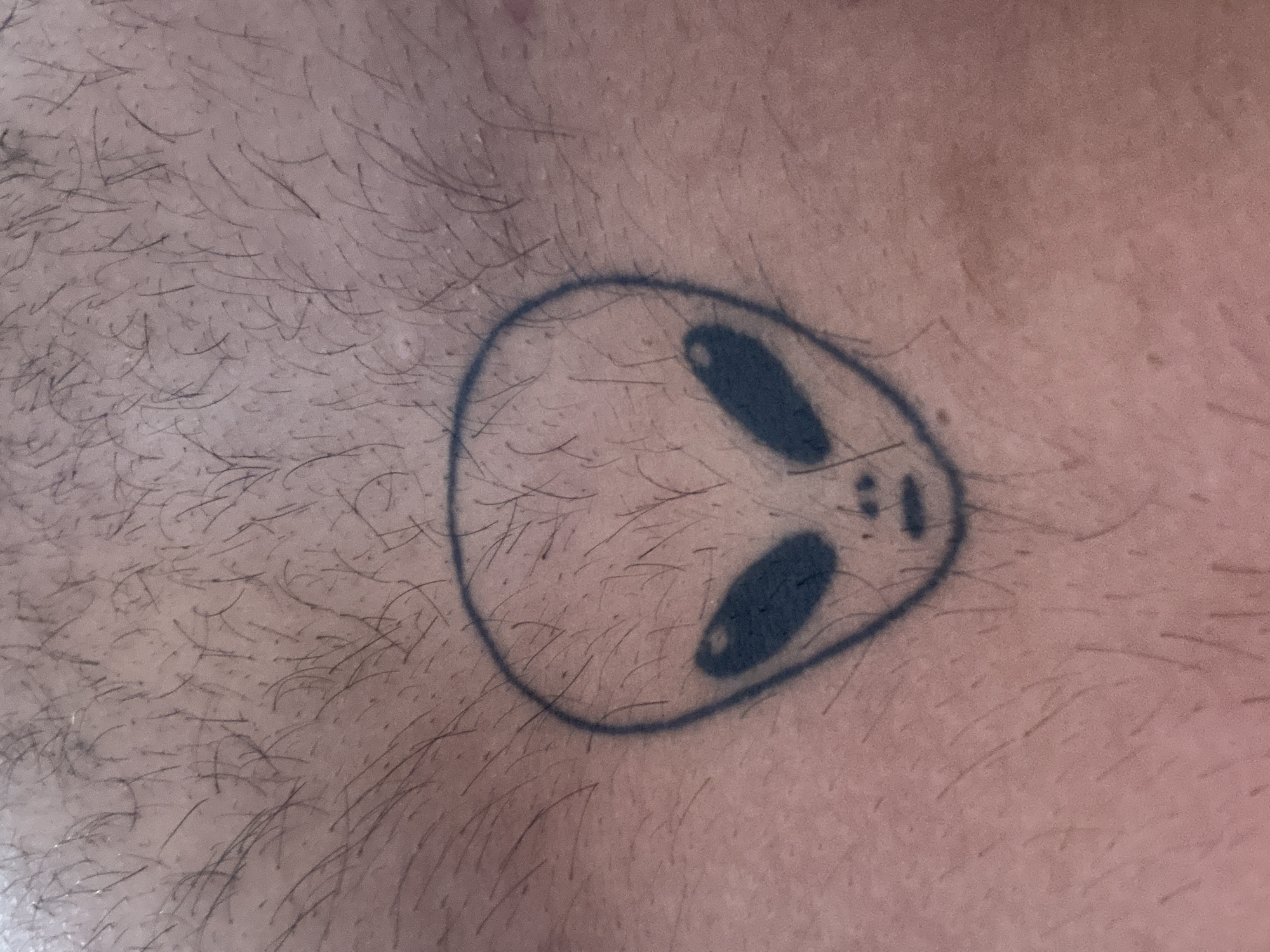 close-up of a fair-skinned human torso with body hair, on which there is a tattoo of a grey alien head. The alien head is outlined in black ink, with large black oval eyes and two short vertical lines below the eyes. The location of the image is not discernible from the given content, therefore, I cannot place it in the city of Tsarevo, Bulgaria.