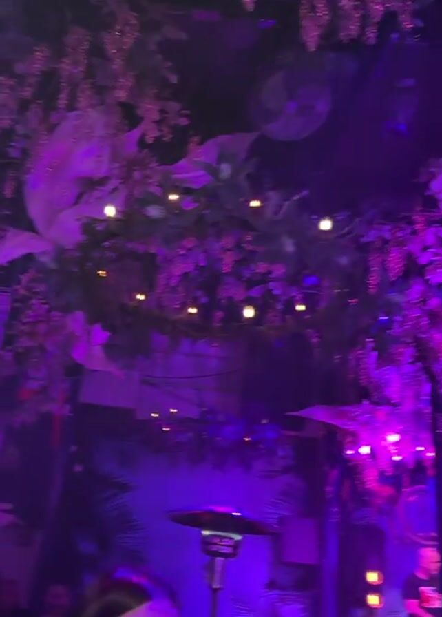 nightclub scene with a mostly purple lighting scheme. There are numerous people, some at tables with glasses and napkins, others standing. An individual operates a DJ deck. Overhead, artificial greenery hangs with lights. In the opening scene, a young woman faces the camera briefly. The camera slowly pans across the space, showcasing the decor and patrons.