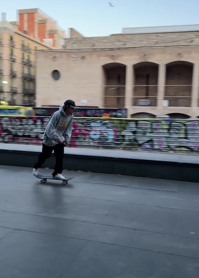 - "A skater wearing a grey hooded sweatshirt, black pants, and a baseball cap is riding on a skateboard outdoors in a city" by FM-dunNm2, licensed under CC BY 4.0